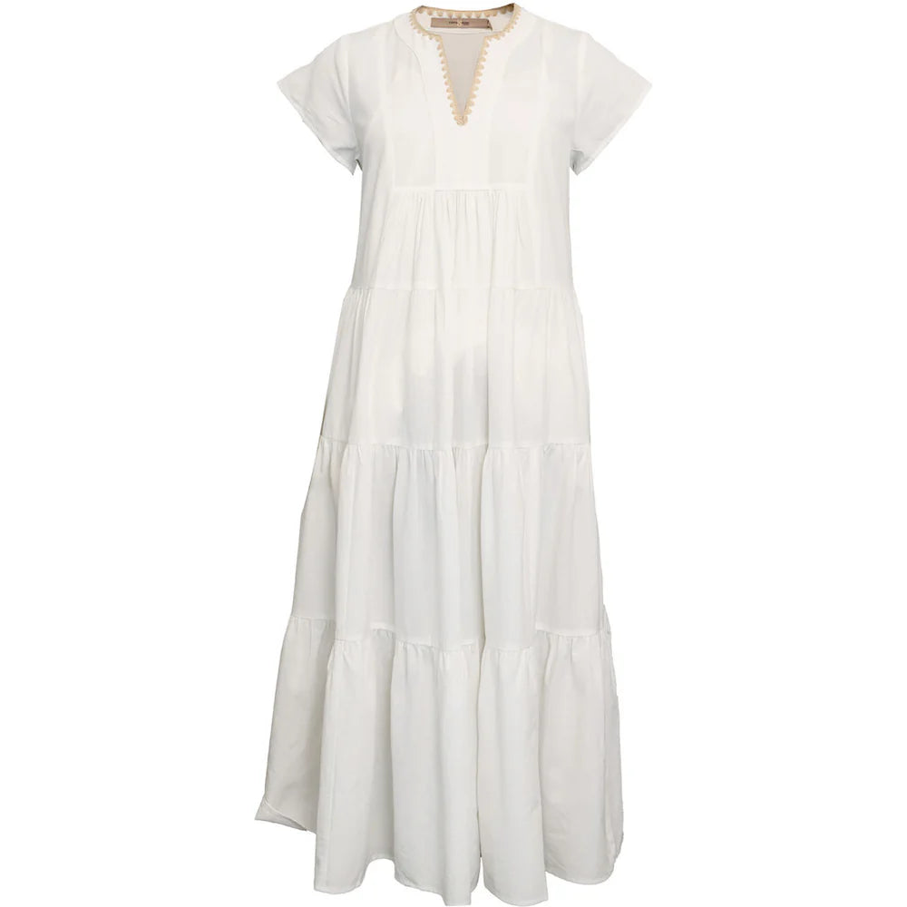 Fin långklänning från vår "Beckie"-serie. Klänningen har flera lager som ger en rynkeffekt och vidd. Klänningen har en liten t-shirtärm och en v-ringning med sömmar i färgen sand.